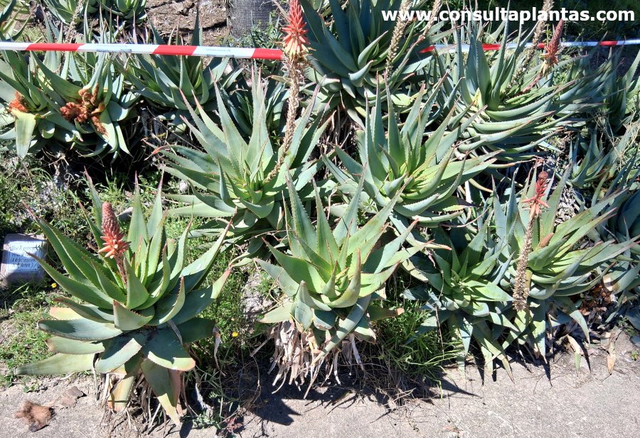 The genus Aloe, family Xanthorrhoeaceae, includes about 500 species of succulent plants native to Africa, Madagascar and the Middle East. Some species are: Aloe x caesia, Aloe x delaetii, Aloe pluridens, Aloe esculenta, Aloe vera, Aloe variegata, Aloe thraskii, Aloe tenuior, Aloe suprafoliata, Aloe striata, Aloe plicatilis, Aloe mitriformis, Aloe marlothii, Aloe maculata, Aloe juvenna, Aloe ferox, Aloe ciliaris, Aloe barberae, Aloe aristata, Aloe arborescens, Aloe aculeata, Aloe x spinosissima. Common name: Mossel Bay Hybrid Aloe. It is a natural hybrid between the species Aloe ferox and Aloe arborescens. Aloe x caesia is a slow-growing, branched, shrubby succulent plant that reaches 2.5 meters (8.2 feet) in height. The fleshy leaves, arranged in a rosette, are bluish-green or light green in color and have teeth on the margins. It produces a flowering stem 90 cm (2.95 feet) tall with red flowers. It blooms in winter and early spring. Mossel Bay Hybrid Aloe is used on dry, sunny slopes, in rockeries, as a single specimen, in cactus and succulent gardens, and in pots when young. They are ideal for Mediterranean coastal gardens. Aloe x caesia prefers full sun exposure but can grow in light shade. Although it tolerates light, occasional frosts, it is best not to expose it to temperatures below 4 °C (39 ºF). The soil can be normal garden soil with 30% coarse sand or a commercial potting mix for cacti and succulents with 20% perlite. Repot in early spring if the pot has become too small. Mossel Bay Hybrid Aloe is a drought-resistant plant that requires moderate watering, waiting until the soil has completely dried out. Reduce watering significantly in winter; if grown outdoors, it can be maintained with winter rains. Fertilize with mineral fertilizer for cacti and succulents once a month during the summer. Prunes withered flower stems after flowering. Aloe x caesia is resistant to common pests and diseases but sensitive to excess moisture at the roots. Mossel Bay Hybrid Aloe is propagated from seeds sown in spring in a sandy seedbed and from cuttings from seedlings in spring or summer. |