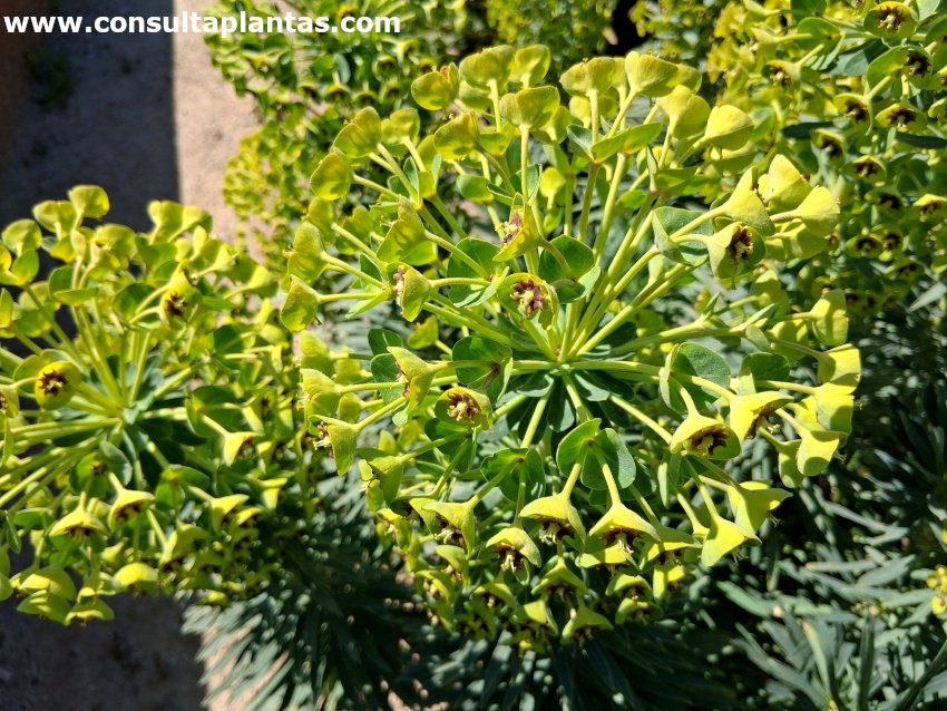 The genus Euphorbia, family Euphorbiaceae, includes 2,000 species of succulents, trees, shrubs, and herbaceous plants of cosmopolitan distribution. Some species are: Euphorbia characias, Euphorbia hypericifolia, Euphorbia piscatoria, Euphorbia lambii, Euphorbia piscatoria, Euphorbia regis-jubae, Euphorbia umbellata, Euphorbia pulcherrima, Euphorbia cotinifolia, Euphorbia milii, Euphorbia dendroides, Euphorbia rigida, Euphorbia leucocephala, Euphorbia anachoreta, Euphorbia tithymaloides. Common names: Mediterranean spurge, Albanian spurge. This species is native to the Mediterranean region. They are Mediterranean plants with soft, purple stems that reach 1 meter (3.28 feet) in height. The leaves are linear, spiral around the stem and are bluish-green in color. The insignificant flowers appear in very attractive yellow bracts. They bloom from late spring to early summer. Mediterranean spurge is used to form clumps in gardens that require little irrigation and to cover dry, sunny slopes. Keep in mind that the latex they produce is irritating. Euphorbia characias prefers full sun exposure but can grow in semi-shade. It resists light and occasional frosts. The soil must be very well drained and light. Water moderately waiting for the substrate to dry; it is important not to flood. Albanian spurge is a resistant plant to the usual pests and diseases. Euphorbia characias propagates by division or by seeds sown in spring. |