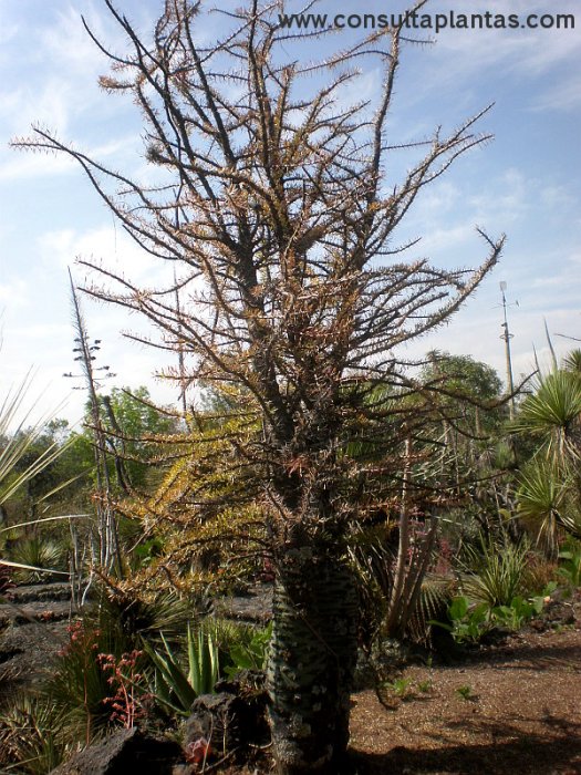 The genus Fouquieria, family Fouquieriaceae, comprises 11 species of shrubs and trees native to northern Mexico and the southwestern United States. Some species are: Fouquieria fasciculata, Fouquieria columnaris, Fouquieria splendens, Fouquieria formosa, Fouquieria macdougalii. Common names: Barrel tree, Tropical Ocotillo. This species is native to Hidalgo and Queretaro, Mexico. Fouquieria fasciculata is a deciduous tree with a trunk thickened at the base (bottle-shaped) that reaches 5 metres (16.4 feet) in height. The leaves, light green in colour, are spatulate in shape. The branches have numerous 2.5 cm (0.98") long spines. The small 1 cm (0.39") long flowers are white and appear in corymbose inflorescences. It blooms in winter. The fruits, brown in colour, are ovoid capsules. Barrel Tree is used as an isolated specimen, to form hedges and impenetrable barriers, on dry and sunny slopes and in pots when young. Fouquieria fasciculata prefers full sun exposure but also grows in light shade. It resists light frosts. It is important that the soil has good drainage; Barrel Tree grows in poor, sandy and stony soils. Always water moderately, waiting for the substrate to dry completely. Fouquieria fasciculata resists drought well. Do not water when the plant has lost its leaves (dormant period). Tropical Ocotillo does not need fertilizer. It is advisable to prune the lower branches to achieve a thicker trunk. Fouquieria fasciculata is a plant resistant to the usual pests and diseases but sensitive to excess moisture in the roots. Tropical Ocotillo is propagated from seeds sown in spring or autumn and by cuttings. |