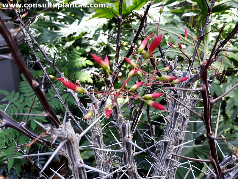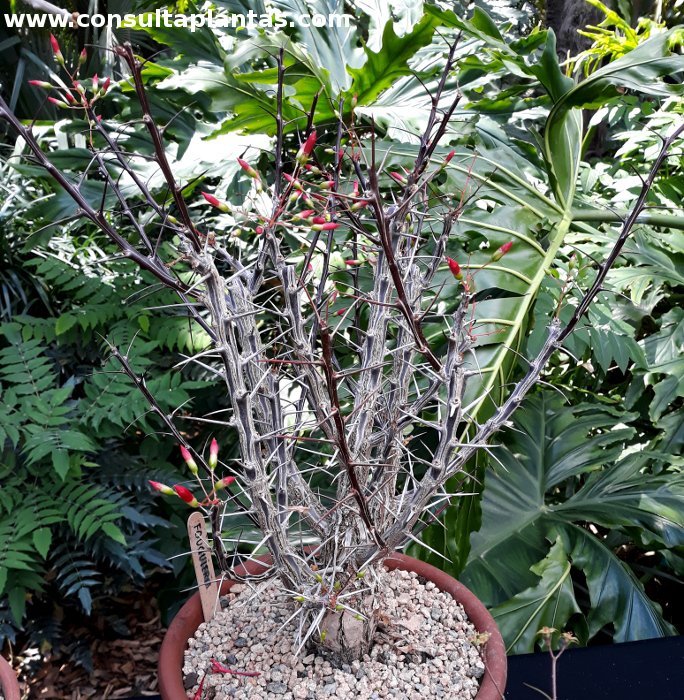 The genus Fouquieria, family Fouquieriaceae, comprises 11 species of shrubs and trees native to northern Mexico and the southwestern United States. Some species are: Fouquieria splendens, Fouquieria columnaris, Fouquieria fasciculata, Fouquieria macdougalii, Fouquieria formosa. Common names: Coachwhip, Candlewood, Coach-whip, Slimwood, Desert coral, Candle Bush, Boojum, Jacob's staff, Jacob cactus, Vine cactus. This species is native to California, Arizona and Texas (USA) and to Zacatecas and Hidalgo (Mexico). Fouquieria splendens is a deciduous tree that branches from the base and is very thorny, reaching 6 metres (19.68 feet) in height. Although it does not have leaves almost all year round, they appear in the rainy season and can be spoon-shaped or elliptical. The plant performs photosynthesis through the stem. The long thorns can reach 4 cm (1.57") in length. The tubular flowers are red. It blooms in spring or summer, always after the rains. Candlewood is used as an isolated specimen, in rockeries, to form impenetrable barriers and hedges, and in pots when they are young. The flowers are edible in salads and to prepare infusions (use dried flowers). Fouquieria splendens grows well in full sun and light shade exposures in warm, dry climates. It resists sporadic frosts. Although it prefers calcareous soil, it grows well in any type of soil that has excellent drainage. Water moderately, waiting for the substrate to dry completely. Do not water when it has lost its leaves, as the plant goes dormant. It is very resistant to drought. Desert coral does not need fertilizer. Prune the basal branches if you want to achieve a thicker trunk. Fouquieria splendens is a plant resistant to the usual pests and diseases but sensitive to excess humidity. Candlewood is propagated by cuttings and from seeds sown in autumn or spring. |