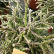 The genus Rhipsalis, family Cactaceae, comprises 35 species of cacti native to tropical regions of Central and South America, Africa and Asia. Some species are: Rhipsalis pilocarpa, Rhipsalis baccifera, Rhipsalis burchellii, Rhipsalis cruciformis, Rhipsalis oblonga, Rhipsalis puniceodiscus, Rhipsalis baccifera, Rhipsalis pachyptera, Rhipsalis cassutha, Rhipsalis rosea. Common names: Hairy Stemmed Rhipsalis, Hairy-fruited wickerware cactus. Scientific synonyms: Rhipsalis peluda, Erythrorhipsalis pilocarpa. This species is native to Brazil. They are epiphytic cacti with a pendant bearing and cylindrical stems that reach 40 cm (15.74") in length. The woolly areolas are oval and have 3-10 whitish spines. The flowers are white, 4 cm (1.57") in diameter and appear at the end of the stems. The fruits are red and very decorative. Hairy Stemmed Rhipsalis is used in hanging pots as indoor plants, greenhouses and on terraces and patios. Rhipsalis pilocarpa can be grown in full sun or semi-shade exposures. The winter safety temperature is 6 ºC (42.8 ºF). The soil can be a mixture of 25% coarse siliceous sand and 75% leaf mulch or heather soil. Water with lime-free water frequently in spring and summer so that the substrate does not dry out completely (never flood). In summer periodically spray the stems with lime-free water. Fertilize once in spring with mineral fertilizer for cacti. Hairy Stemmed Rhipsalis does not need pruning. Rhipsalis pilocarpa can be attacked by mites and aphids if ventilation is not proper and it suffers from drought. Hairy-fruited wickerware cactus propagates easily by seed or stem cuttings in spring. |