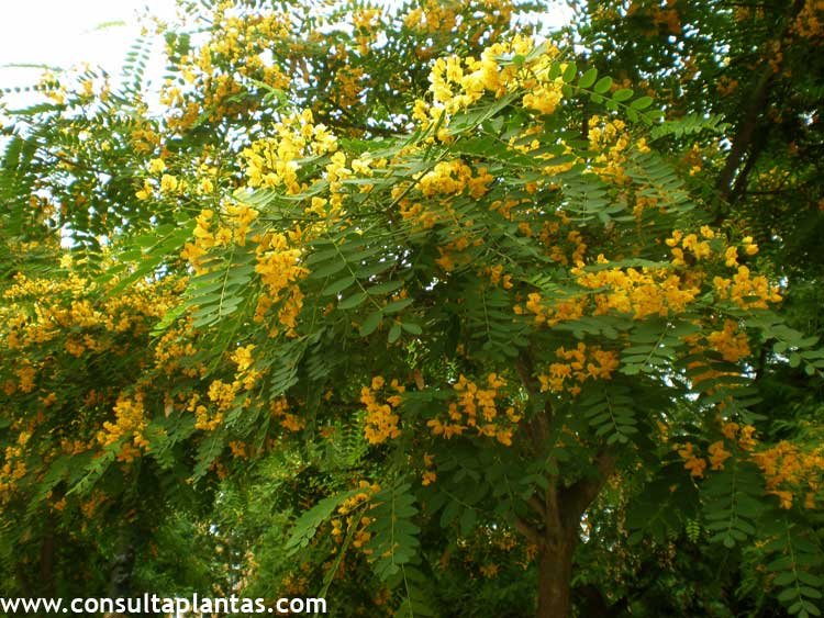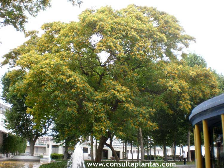 The genus Tipuana, family Fabaceae, comprises 8 species of trees native to South America. Some species are: Tipuana tipu, Tipuana erythrocarpa, Tipuana mucronata, Tipuana auriculata. Common names: Tipu tree, Tipa, Rosewood, Pride of Bolivia. This species is native to South America. They are fast-growing trees with a wide crown that reach 18 meters (59 feet) in height. The leaves are odd-pinnate, semi-evergreen and light green. The interesting yellow flowers with reddish spots in the center appear in terminal racemes. They bloom in late spring and early summer. They produce fruits in the shape of samara. Tipu tree is used as shade trees in large gardens, in public parks and on streets. It combines very well with the Jacarandas due to the chromatic contrast of the flowers (in Barcelona you can see both species in the Plaza de la Sagrada Familia). Do not plant near buildings due to the strong aggressive roots of this plant. Tipuana tipu needs full sun or semi-shade exposure and warm temperatures. It resists occasional frosts. Rosewood can grow in any normal garden soil and in limestone soils. Water moderately throughout the year waiting for the soil to have completely dried; Pride of Bolivia resists drought. Prune in late winter to keep it compact. Tipuana tipu is a plant resistant to the usual pests and diseases. Tipu tree is propagated from seeds sown in spring. |