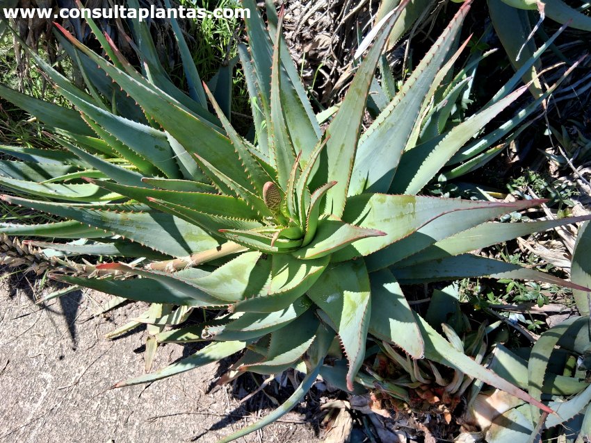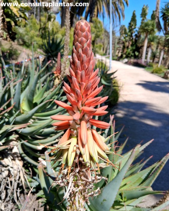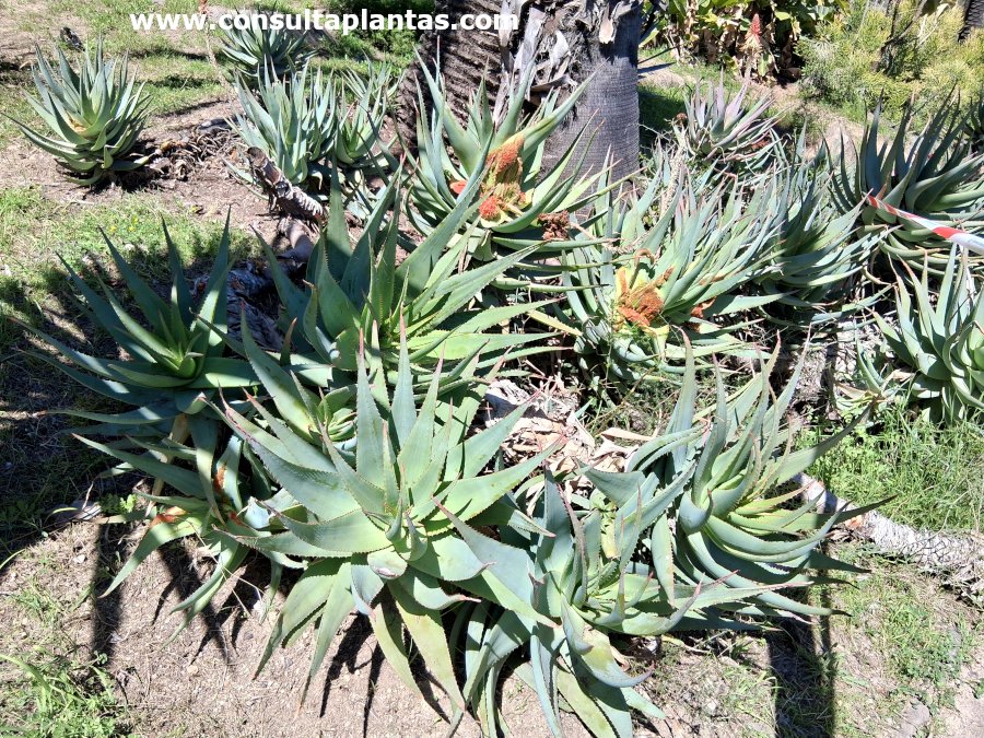 El género Aloe, familia Xanthorrhoeaceae, comprende unas 500 especies de plantas suculentas originarias de África, Madagascar y Oriente Medio. Algunas especies son: Aloe x caesia, Aloe pluridens, Aloe esculenta, Aloe suprafoliata, Aloe striata, Aloe ciliaris, Aloe aculeata, Aloe arborescens, Aloe vera, Aloe ferox, Aloe x spinosissima, Aloe mitriformis, Aloe marlothii, Aloe plicatilis, Aloe maculata, Aloe aristata, Aloe variegata, Aloe thraskii, Aloe juvenna, Aloe barberae, Aloe tenuior. Recibe el nombre vulgar de Áloe híbrido de la Bahía de Mossel. Es un híbrido natural entre las especies Aloe ferox y Aloe arborescens. El Aloe x caesia es una planta suculenta de porte arbustivo ramificado y crecimiento lento que alcanza 2,5 metros de altura. Las carnosas hojas, dispuestas en roseta, son de color verde azulado o verde claro y presentan dientes en el margen. Produce un tallo floral de 90 cm de altura con flores rojas. Florece en invierno y a principios de primavera. El Áloe híbrido de la Bahía de Mossel se utiliza en taludes secos y soleados, en rocallas, como ejemplar aislado, en jardines de cactus y plantas suculentas y en maceta cuando son jóvenes. Son ideales para jardines costeros mediterráneos. El Aloe x caesia prefiere una exposición de pleno sol pero puede crecer en sombra ligera. Aunque resiste heladas ligeras y ocasionales es mejor no exponerla a menos de 4 ºC. El suelo puede ser una tierra normal de jardín con un 30% de arena gruesa o un sustrato comercial para cactus y plantas suculentas con un 20% de perlita. Trasplantar a principios de primavera si la maceta se ha quedado pequeña. El Aloe x caesia es una planta resistente a la sequía que necesita riego moderado esperando a que el suelo se haya secado por completo. Reducir mucho el riego en invierno; si se cultiva en exterior se mantiene con las lluvias invernales. Abonar con fertilizante mineral para cactus y plantas suculentas un vez al mes durante el verano. Podar los tallos florales marchitos tras la floración. El Aloe x caesia es una planta resistente a las habituales plagas y enfermedades pero sensible al exceso de humedad en las raíces. El Áloe híbrido de la Bahía de Mossel se propaga a partir de semillas sembradas en primavera en semillero arenoso y mediante esquejes de hijuelos en primavera o en verano. |