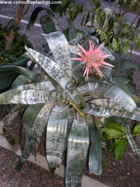 El género Aechmea comprende más de 140 especies de bromelias originarias de América Central y del Sur. Otras especies son: Aechmea fendleri, Aechmea fulgens, Aechmea distichantha, Aechmea recurvata, Aechmea chantinii, Aechmea fosteriana. Recibe los nombres vulgares de Aecmea, Piñuela, Bromelia fasciada y Lengua de suegra. La Aechmea fasciata es una bromelia con hojas en roseta de color verde-gris con rayas transversales y borde espinoso. Las flores en realidad son azuladas y muy pequeñas; lo que vemos de color rosa son las brácteas (hojas modificadas). Es importante saber que sólo florecen una vez y que no suelen florecer los ejemplares conseguidos a partir de hijuelos. La Bromelia fasciada se suele utilizar como planta de interior o de invernadero. La Aecmea necesita una exposición en semisombra, por ejemplo cerca de ventanas orientadas al sur o al este y protegidas del sol directo. El ambiente debe ser húmedo y la temperatura cálida (20-30 ºC). Puede resistir hasta 15 ºC, no menos. El suelo ideal sería una mezcla, a partes iguales, de arena, turba, mantillo de hojas y esfagno (musgo de turbera). Regar con agua sin cal, muy escasamente en invierno y un poco más en verano (por ejemplo, un vaso de agua en el centro de la planta). La Aechmea fasciata no necesita poda ni abono. La Bromelia fasciada no suele ser atacada por plagas y enfermedades, sólo debemos vigilar las condiciones de humedad y temperatura. La Piñuela se propaga en primavera a partir de los retoños que aparecen en la base de la planta madre. |