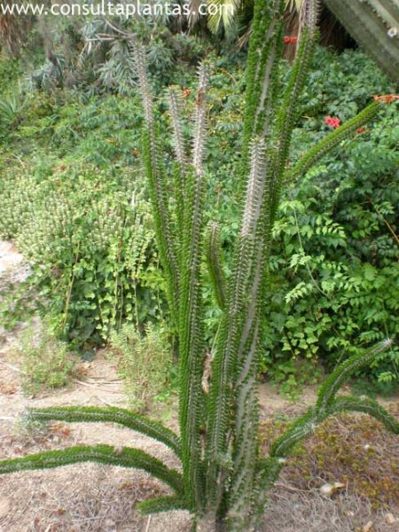El género Alluaudia, familia Didiereaceae, comprende 6 especies de plantas suculentas endémicas de la isla de Madagascar. Algunas especies son: Alluaudia ascendens, Alluaudia procera, Alluaudia comosa. La Didierea ascendens es una planta suculenta caducifolia que alcanza más de 15 metros de altura. Lo más interesante es su tronco recubierto de espinas y de pequeñas hojas carnosas perfectamente alienadas verticalmente; cuando la planta pierde las hojas es el tallo el que realiza la fotosíntesis. Produce flores masculinas y femeninas al final de los tallos, aunque no tienen interés ornamental. Florece en otoño. Se utiliza como ejemplar aislado, en pequeños grupos y en jardines de cactus y plantas suculentas. La Alluaudia ascendens necesita una exposición de pleno sol y no tolera el frío. Prefiere un suelo arenoso que drene perfectamente. Regar moderadamente cuando tiene hojas y sólo ocasionalmente cuando las pierda, pues entra en reposo. Si hace mucho calor se pueden rociar las hojas con agua a primera hora de la mañana. La Didierea ascendens no necesita abono ni poda. Es una planta resistente a las habituales plagas pero sensible al exceso de humedad. La Alluaudia ascendens se puede propagar por esquejes leñosos del tallo o por semillas sembradas a final de invierno. |