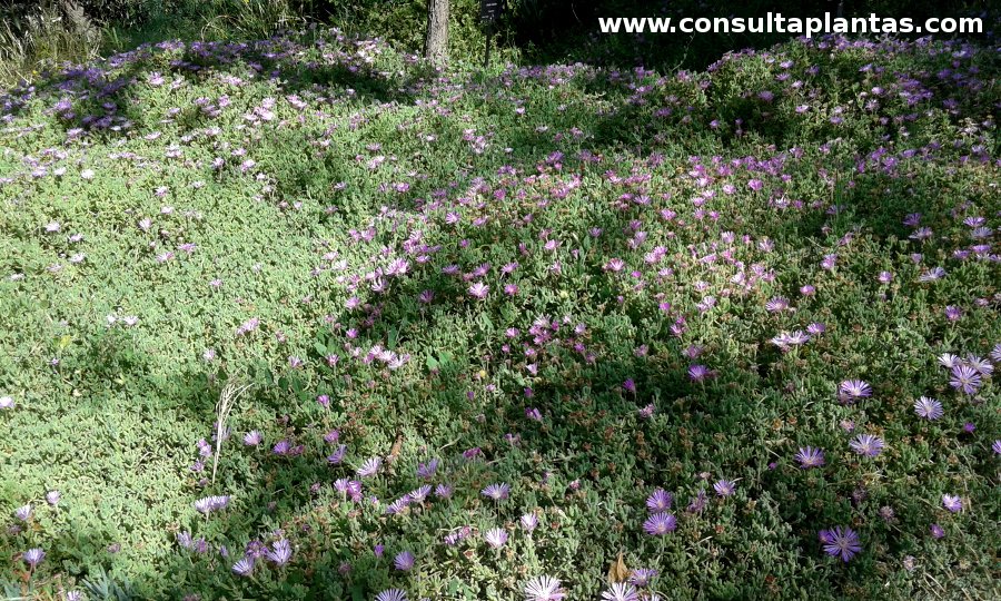 El género Drosanthemum pertenece a la familia Aizoaceae y lo componen más de 100 especies de plantas suculentas originarias de Sudáfrica. Algunas especies son: Drosanthemum floribundum, Drosanthemum hispidum, Drosanthemum diversifolium, Drosanthemum speciosum, Drosanthemum bicolor. También se conoce por los nombres vulgares de Rocío rosa, Drosantemo y Mesen y el sinónimo científico de Mesembryanthemum floribundum. El Drosanthemum floribundum es una planta perenne de porte rastrero (de 10-15 cm de altura) con hojas suculentas de color grisáceo y con pequeñas papilas cristalinas. Produce numerosas flores de finos pétalos de color rosa. Florece en primavera. El Drosantemo se emplea para cubrir zonas secas del jardín siendo ideal para jardines mediterráneos, junto al mar o en jardineras y macetas para terrazas y balcones. Esta planta, de crecimiento rápido, necesita una exposición de pleno sol y temperaturas cálidas, si bien puede tolerar alguna helada de hasta -5 ºC. El Rocío rosa prospera en cualquier tipo de suelo, aunque sea seco y pobre, siempre y cuando esté muy bien drenado. El Mesembryanthemum floribundum es una planta de fácil cultivo y muy resistente a la sequía que necesita riegos muy moderados; si se riega demasiado produce menos flores y puede sufrir ataques de hongos. Es suficiente con el abonado anual del jardín con fertilizante orgánico. Si se cultiva en maceta conviene hacer un par de aportes de fertilizante mineral para plantas suculentas en primavera. El Drosantemo no necesita poda pero le conviene algún recorte en otoño para controlar su crecimiento y hacerla más compacta. El Rocío rosa es una planta muy resistente a las plagas y enfermedades que sólo teme el exceso de riego. La mejor forma de propagarlas es mediante esquejes realizados a partir de los restos de los recortes realizados en otoño. |