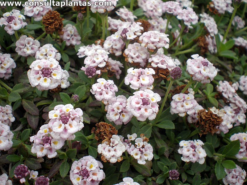 En la familia de las Verbenaceae se integra el género Lippia formado por unas 200 especies de arbustos y subarbustos originarios de regiones tropicales y subtropicales de América y de África. También se conoce por los nombres vulgares de Bella alfombra y Lipia y por los sinónimos científicos de Lippia nodiflora, Phyla nodiflora y Lippia canescens. Esta especie procede de América Central. La Lippia repens es una planta tapizante que no levanta 10 cm del suelo y presenta pequeñas hojas elípticas con los bordes aserrados. Sus abundantes flores aparecen en grupos redondeados parecidos a las cabezas florales de las Lantanas y son de color blanco (algo rosado) con el centro amarillo. Florece desde mitad de la primavera y hasta casi final del verano. Se utiliza para fijar taludes, en rocallas, para cubrir zonas secas del jardín y senderos ya que es una cubridora pisable. Puede sustituir al césped en lugares secos y junto al mar. Es ideal para jardines costeros mediterráneos y para ciudades por su resistencia a la contaminación. La Bella alfombra prospera mejor en una exposición soleada pero puede vivir también en semisombra. Prefiere los climas cálidos (subtropical, mediterráneo, tropical) si bien puede resistir alguna helada de hasta -5 ºC. La Lippia repens no es nada exigente con el suelo (tolera hasta la cal) mientras esté bien drenado. La plantación se hará en otoño o primavera a razón de unos 5 ejemplares por metro cuadrado. Es muy resistente a la sequía pero agradece riegos regulares, siempre esperando a que la tierra esté seca antes de volver a regar. La Bella alfombra no precisa de abono. Más que poda lo que necesita es que controlemos su rápido crecimiento pues puede convertirse en invasora. La Lipia es una planta resistente que no suele ser atacada por plagas y enfermedades. La forma más sencilla de propagarla es a partir de esquejes realizados durante la primavera o el otoño. |