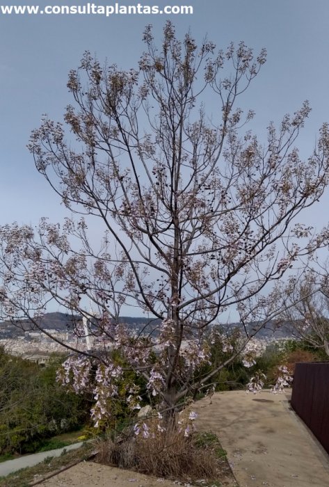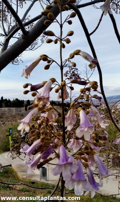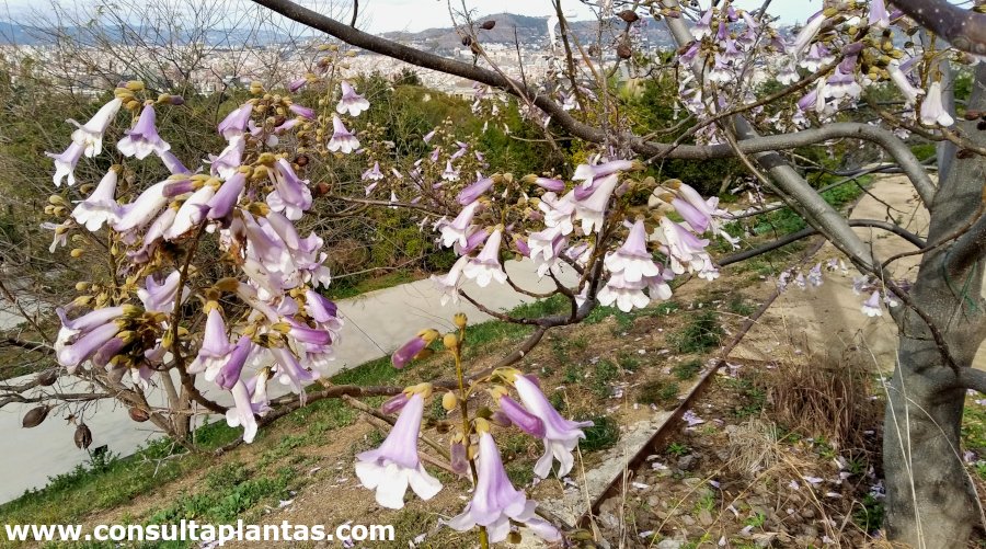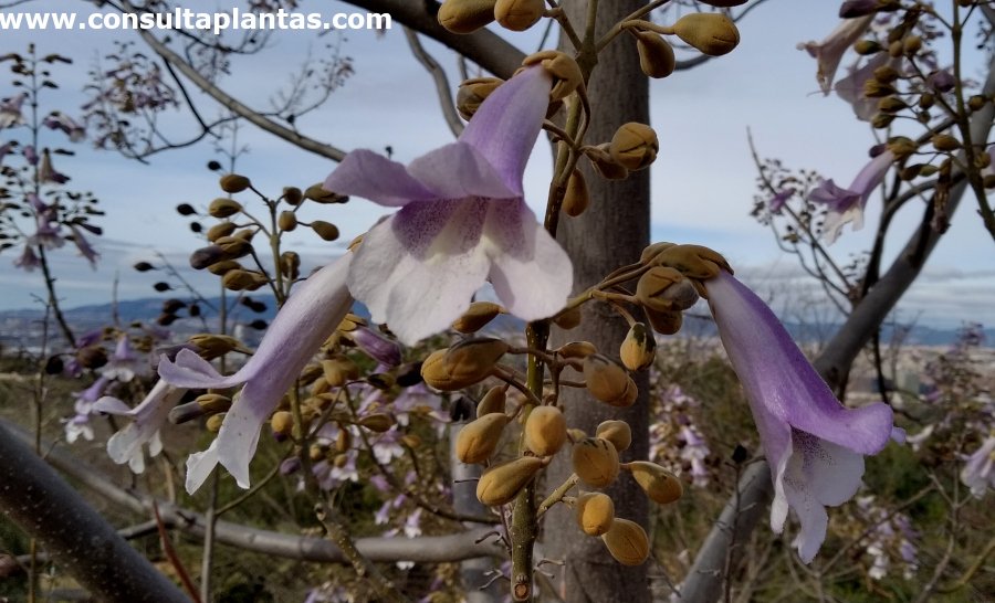 El género Paulownia, familia Paulowniaceae, incluye unas 17 especies de árboles originarias de Asia. Algunas especies son: Paulownia elongata, Paulownia fortunei, Paulownia tomentosa, Paulownia imperialis, Paulownia coreana. Recibe los nombres vulgares de Paulonia, Árbol kiri, Árbol dedalero y Árbol de la emperatriz. Esta especie procede de Extremo Oriente (China, Japón). La Paulownia elongata es un árbol caducifolio de copa redondeada y crecimiento rápido que alcanza 30 metros de altura. Las grandes hojas de hasta 60 cm son de color verde intenso con manchas de color óxido. Las vistosas y abundantes flores perfumadas con forma de trompeta aparecen en racimos verticales y son de color lila-violáceo y blanco; florece en primavera y las hojas brotan después de las flores. Los frutos son cápsulas elípticas de color marrón. La Paulonia se utiliza como árbol de sombra, en hileras para parques públicos y como ejemplares aislados protegidos del viento. Es ideal para jardines mediterráneos pero no en primera línea de mar. Atrae a las abejas. La Paulownia elongata crece en exposiciones de pleno sol y de semisombra. Aunque prefiere un clima cálido puede resistir heladas hasta -17 ºC. La Paulonia prefiere un suelo rico en materia orgánica, fresco y bien drenado. La plantación en la ubicación definitiva se realiza en primavera o en otoño. Regar regularmente para que el sustrato nunca llegue a secarse por completo. Regar un poco más en verano. Abonar en otoño con compost o con estiércol y durante primavera y verano añadir fertilizante mineral cada 2 semanas. Es recomendable podar muy ligeramente solamente los ejemplares jóvenes para mantener un porte redondeado. Esta planta no suele presentar graves problemas de plagas y enfermedades. La Paulownia elongata se propaga a partir de semillas sembradas en primavera. |