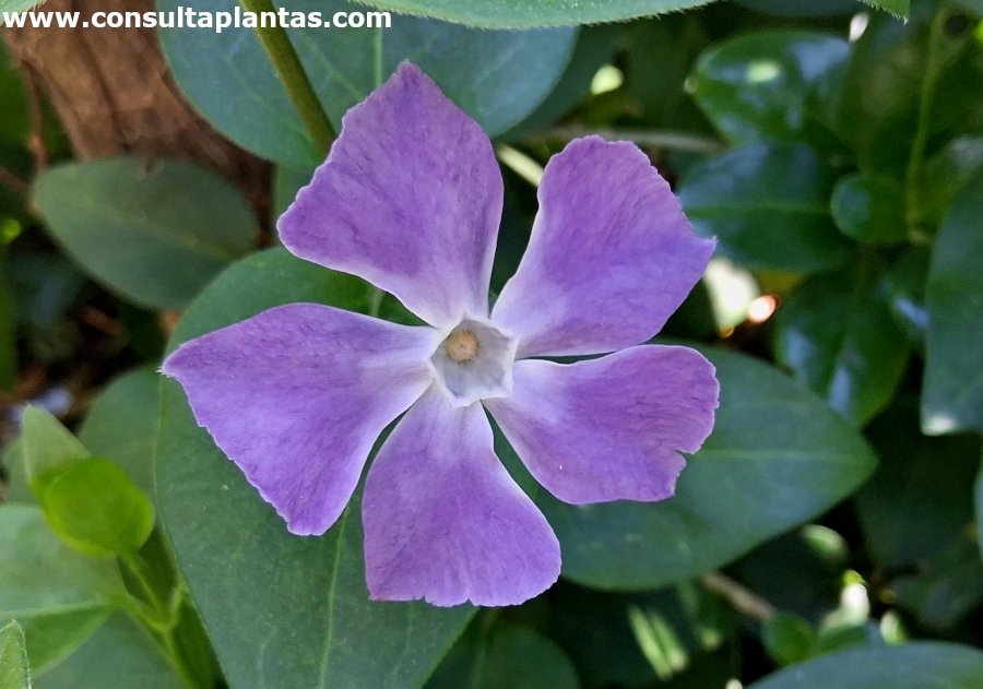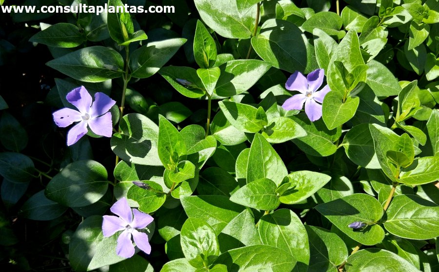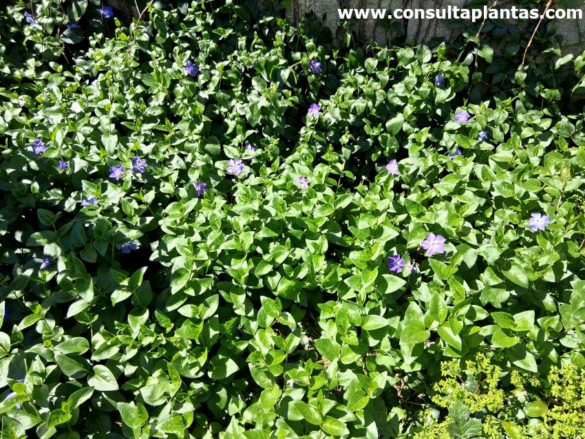 Recibe los nombres vulgares de Vincapervinca mayor, Hierba doncella, Violeta de las brujas y Violeta de burro. Esta especie procede de la cuenca mediterránea.