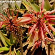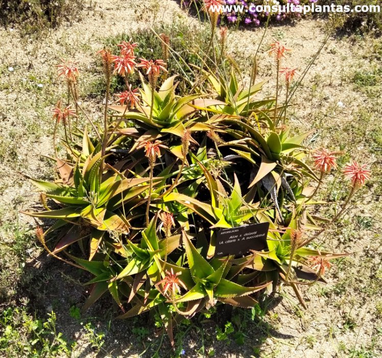 El género Aloe, familia Xanthorrhoeaceae, comprende unas 500 especies de plantas suculentas originarias de África, Madagascar y Oriente Medio. Algunas especies son: Aloe pluridens, Aloe esculenta, Aloe suprafoliata, Aloe striata, Aloe ciliaris, Aloe aculeata, Aloe arborescens, Aloe vera, Aloe ferox, Aloe x spinosissima, Aloe mitriformis, Aloe marlothii, Aloe plicatilis, Aloe maculata, Aloe aristata, Aloe variegata, Aloe thraskii, Aloe juvenna, Aloe barberae, Aloe tenuior, Aloe x caesia. Recibe el nombre vulgar de Áloe híbrido. Es un híbrido entre las especies Aloe ciliaris y Aloe succotrina. El Aloe x delaetii es una planta suculenta de porte compacto que produce hijuelos laterales y alcanza 1 metro de altura. Las carnosas hojas dispuestas en roseta son de color verde azulado o verde claro con tonos rojizos (si recibe mucho sol) y presentan los márgenes dentados. Produce tallos florales por encima de las hojas con flores rojizas o anaranjadas. Puede florecer durante todo el año. El Áloe híbrido se utiliza en rocallas, para cubrir taludes secos y soleados, como ejemplar aislado, en jardines de cactus y plantas suculenta y en macetas para patios y terrazas. El Aloe x delaetii crece bien en exposiciones de pleno sol o de sombra ligera y en climas cálidos y secos. Resiste heladas ocasionales hasta -5 ºC. El suelo puede ser un sustrato comercial para cactus y plantas suculentas o una tierra normal de jardín con un 25% de arena gruesa o de perlita. Es una planta muy resistente a la sequía que necesita riego moderado esperando a que se haya secado el sustrato por completo. En primavera regar cada 3 semanas, en verano cada 2 semanas, reducir mucho el riego a partir de otoño y casi no regar en invierno. Abonar mensualmente con fertilizante mineral para cactus y plantas suculentas durante la primavera y el verano. Podar las inflorescencias marchitas y las hojas secas. El Aloe x delaetii es una planta resistente a las habituales plagas y enfermedades pero sensibles al exceso de humedad. El Áloe híbrido se propaga mediante división de los hijuelos que produce la planta madre y a partir de semillas sembradas en primavera. |