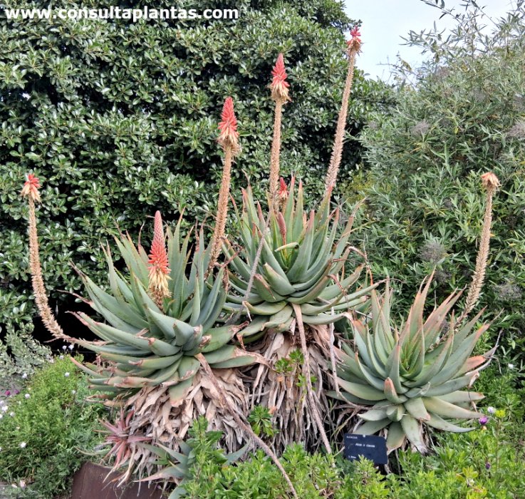 El género Aloe, familia Xanthorrhoeaceae, comprende unas 500 especies de plantas suculentas originarias de África, Madagascar y Oriente Medio. Algunas especies son: Aloe x caesia, Aloe pluridens, Aloe esculenta, Aloe suprafoliata, Aloe striata, Aloe ciliaris, Aloe aculeata, Aloe arborescens, Aloe vera, Aloe ferox, Aloe x spinosissima, Aloe mitriformis, Aloe marlothii, Aloe plicatilis, Aloe maculata, Aloe aristata, Aloe variegata, Aloe thraskii, Aloe juvenna, Aloe barberae, Aloe tenuior. Recibe el nombre vulgar de Áloe híbrido de la Bahía de Mossel. Es un híbrido natural entre las especies Aloe ferox y Aloe arborescens. El Aloe x caesia es una planta suculenta de porte arbustivo ramificado y crecimiento lento que alcanza 2,5 metros de altura. Las carnosas hojas, dispuestas en roseta, son de color verde azulado o verde claro y presentan dientes en el margen. Produce un tallo floral de 90 cm de altura con flores rojas. Florece en invierno y a principios de primavera. El Áloe híbrido de la Bahía de Mossel se utiliza en taludes secos y soleados, en rocallas, como ejemplar aislado, en jardines de cactus y plantas suculentas y en maceta cuando son jóvenes. Son ideales para jardines costeros mediterráneos. El Aloe x caesia prefiere una exposición de pleno sol pero puede crecer en sombra ligera. Aunque resiste heladas ligeras y ocasionales es mejor no exponerla a menos de 4 ºC. El suelo puede ser una tierra normal de jardín con un 30% de arena gruesa o un sustrato comercial para cactus y plantas suculentas con un 20% de perlita. Trasplantar a principios de primavera si la maceta se ha quedado pequeña. El Aloe x caesia es una planta resistente a la sequía que necesita riego moderado esperando a que el suelo se haya secado por completo. Reducir mucho el riego en invierno; si se cultiva en exterior se mantiene con las lluvias invernales. Abonar con fertilizante mineral para cactus y plantas suculentas un vez al mes durante el verano. Podar los tallos florales marchitos tras la floración. El Aloe x caesia es una planta resistente a las habituales plagas y enfermedades pero sensible al exceso de humedad en las raíces. El Áloe híbrido de la Bahía de Mossel se propaga a partir de semillas sembradas en primavera en semillero arenoso y mediante esquejes de hijuelos en primavera o en verano. |