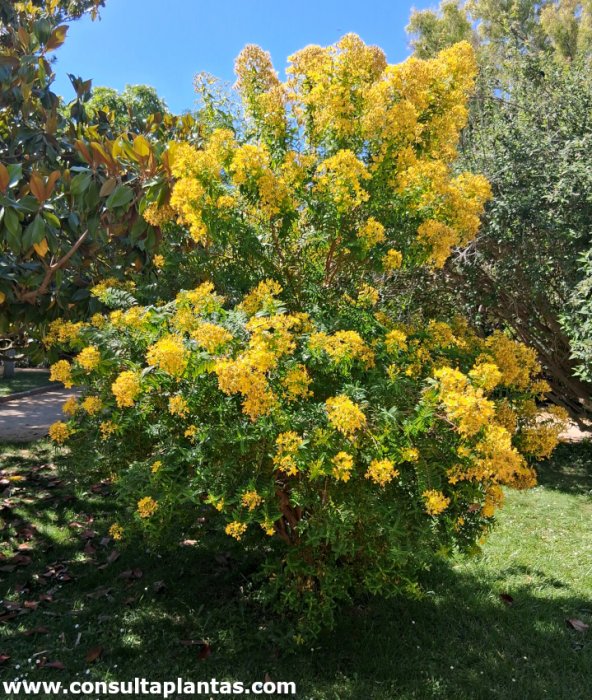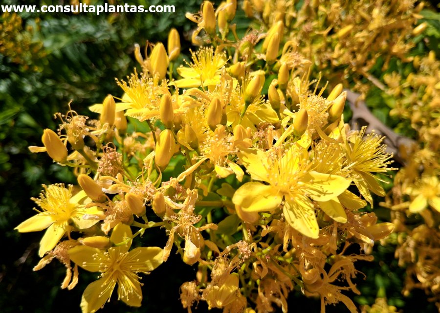 The genus Hypericum, family Hypericaceae, includes some 400 species of herbaceous plants, shrubs and trees with a cosmopolitan distribution. Some species of the genus are: Hypericum canariense, Hypericum grandifolium, Hypericum revolutum, Hypericum calycinum, Hypericum olympicum, Hypericum roeperianum, Hypericum polyphyllum, Hypericum elatum, Hypericum fragile, Hypericum balearicum, Hypericum x inodorum. Common name: Canary Island hypericum, Canary Island St. Johnswort, Grenadillo. This species is native to the Canary Islands and Madeira. They are highly branched shrubs with fragile stems that reach 3 meters (9.84 feet) in height. The narrow oval or linear-lanceolate leaves are deep green; in summer they can lose many leaves if they suffer intense drought but they sprout again. Small, scented golden-yellow flowers appear on branching inflorescences. They bloom in spring but can bloom for most of the year. These easy-to-grow plants are used in rockeries, in bush groups, on slopes and as isolated specimens. Hypericum canariense grows in full sun and partial shade exposures and in a warm climate. It does not resist frost. Canary Island hypericum grows in almost all types of soil that are well drained. You can use a normal well-drained garden soil with coarse sand to which a little organic matter will be added. Canary Island St. Johnswort is a drought-resistant shrub that needs moderate watering, waiting for the substrate to dry completely. Fertilize with a little compost at the end of winter. Grenadillo can be lightly pruned in late winter to maintain a compact habit. Hypericum canariense is a plant resistant to the usual pests and diseases. Canary Island hypericum is propagated by cuttings and from seeds sown in spring. |
