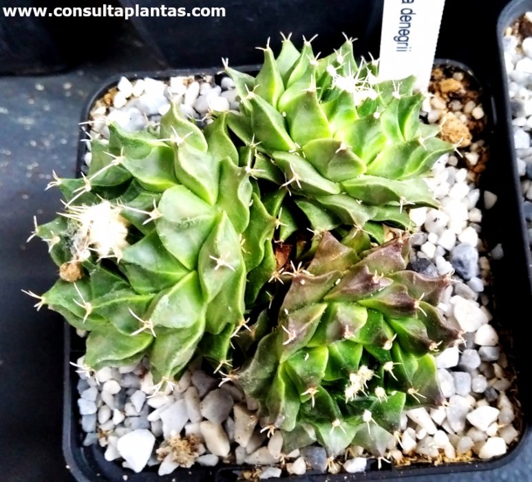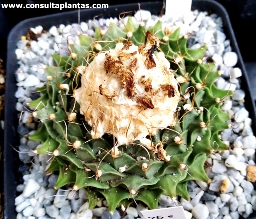 Obregonia denegrii is the only species in the genus Obregonia, family Cacteae; It's a cactus native to Tamaulipas (Mexico). Common name: Artichoke cactus. Scientific synonyms: Ariocarpus denegrii, Strombocactus denegrii. They are curious slow-growing cacti that look like a conifer pineapple and reach 12 cm (4.7") in diameter. What look like rosette leaves are actually spirally arranged tubers. They have spines on the white areolas that are lost with age. White flowers appear on the woolly upper part of the plant. They bloom during the summer but until they are at least 7 years old they do not. Finally, the fruits appear, white and edible, among the woolly ones. Artichoke cactus is used in pots as indoor, greenhouse or patio and terrace plants. Obregonia denegrii prefers a semi-shaded or shaded exposure; locate it facing east or southeast so that it receives sun early in the day. The winter temperature should not be less than 4 ºC (39.2 ºF). Artichoke cactus prefers a calcareous and well-drained soil; use a commercial cactus substrate. Water regularly in spring and summer waiting for the substrate to have dried well; reduce watering in fall and do not water in winter. Obregonia denegrii does not need fertilizers or pruning. Artichoke cactus generally does not suffer from pest attacks but are sensitive to overwatering. Obregonia denegrii is propagated from seeds sown in spring in the seedbed but their germination and growth are slow processes. You can try to graft on a columnar cactus but it's not always possible. |