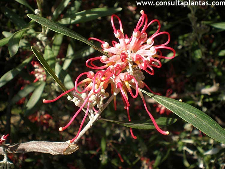 El género Grevillea, familia Proteaceae, comprende unas 500 especies de arbustos y árboles distribuidas por Australia y de Papúa-Nueva Guinea. Algunas especies son: Grevillea olivacea, Grevillea lanigera, Grevillea johnsonii, Grevillea brachystachya, Grevillea robusta, Grevillea juniperina, Grevillea alpina, Grevillea rosmarinifolia, Grevillea sulphurea, Grevillea thyrsoides, Grevillea crithmifolia, Grevillea Clearview David, Grevillea Golden Yu-Lo. Recibe el nombre vulgar de Grevillea. Esta especie es originaria del sudoeste de Australia Occidental. Son arbustos perennifolios de porte compacto que alcanzan 4 metros de altura. Las hojas son de color verde grisáceo y similares a las del olivo. Las curiosas y atractivas flores con forma de araña pueden ser de color rojo, naranja o amarillo. Florecen desde el invierno hasta la primavera. Se utilizan como ejemplares aislados, para formar setos y pantallas cortaviento, en laderas secas y soleadas y en grupos arbustivos. Son ideales para jardines costeros mediterráneos por su resistencia al viento. Atraen a mariposas y abejas. La Grevillea olivacea necesita una exposición de pleno sol y un clima mediterráneo. Resisten heladas ligeras y ocasionales. Crecen en cualquier tipo de suelo que disponga de un drenaje excelente. La plantación se hace en otoño. La Grevillea olivacea es una planta muy resistente a la sequía que necesita riego moderado esperando a que se haya secado el sustrato por completo. Abonar con un poco de compost en otoño. Podar tras la floración acortando ligeramente los brotes que hayan florecido. La Grevillea olivacea es una planta resistente a las habituales plagas y enfermedades pero sensible a la acumulación de agua en las raíces. Se propagan a partir de semillas sembradas en primavera o en otoño en semillero y mediante esquejes semileñosos. |