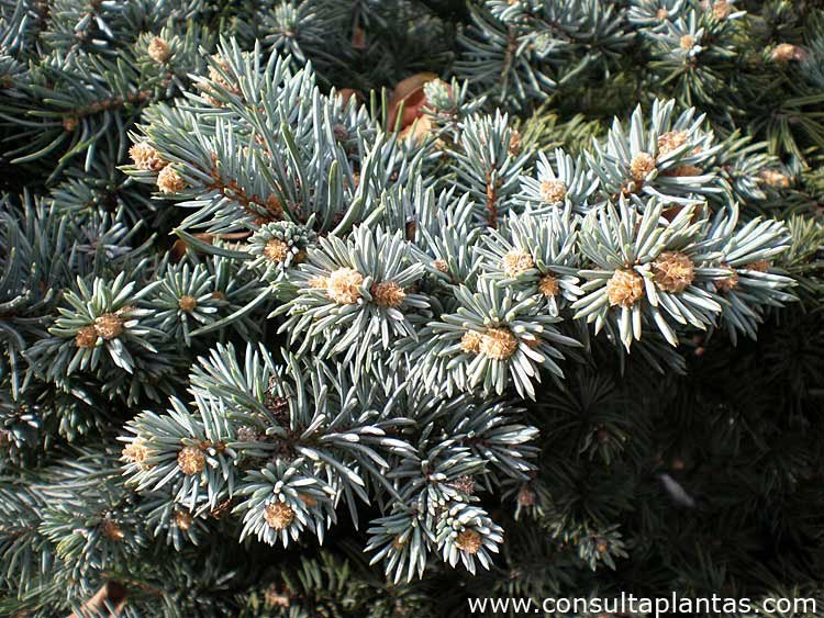 En la familia de las Pinaceae se encuadra el género Picea formado por 35 especies de árboles distribuidos por zonas templadas y frías de Asia, Europa y Norteamérica. Algunas especies son: Picea pungens, Picea mariana, Picea abies, Picea orientalis, Picea rubens, Picea koyamae. Recibe los nombres vulgares de Abeto azul, Pícea de Colorado y Pícea azul. Es una especie nativa de las Montañas Rocosas en Norteamérica. La Picea pungens es una conífera de corteza gris purpúrea y porte piramidal que alcanza los 15 metros de altura y los 5 metros de anchura. Las hojas son aciculares, de color azul plateado (con la edad se tornan verdes) y alcanzan hasta 3 cm de longitud. Produce flores masculinas y femeninas que no tienen interés ornamental. Finalmente aparecen las piñas colgantes cilíndricas. Este árbol de crecimiento muy lento se emplea principalmente como ejemplar aislado. Es muy indicado para parques públicos por su resistencia a la contaminación. El Abeto azul puede vivir en una exposición de pleno sol y de semisombra. Resiste muy bien intensas heladas pero sufre con los calores estivales del verano mediterráneo; es ideal para zonas de clima fresco y húmedo. La Picea pungens prefiere suelos fértiles con bastante materia orgánica y bien drenados, si bien prospera también en terrenos más pobres e incluso algo inundados. Necesita riegos frecuentes para que el terreno nunca llegue a secarse completamente. Es conveniente abonar con compost al iniciarse la primavera o en otoño. Se recomienda no podarlo a no ser que haya que eliminar ramas secas o dañadas (mejor a principios de otoño). La Pícea de Colorado no suele sufrir ataques importantes de plagas y enfermedades. La propagación se realiza a partir de semillas sembradas en primavera pero es un proceso lento. |